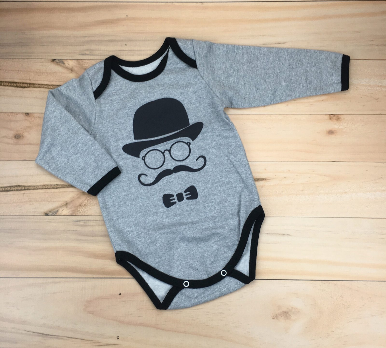 Soft studio lighting and minimal styling bring focus to this e-commerce product photography Toronto series, showcasing a grey cotton baby bodysuit with a fun gentleman-inspired design. The setup highlights fabric softness, clean edges, and playful print details, creating a natural and polished look for online stores or catalog presentation. This shoot combines warmth, clarity, and professionalism — ideal for modern baby fashion brands.