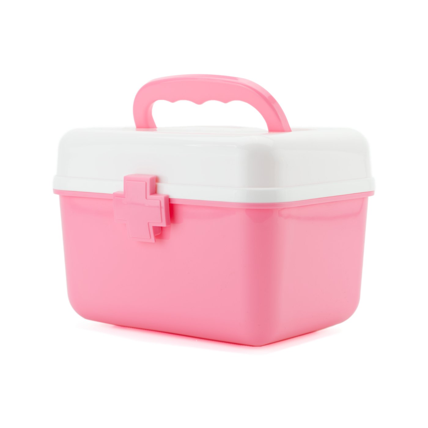 Studio product photography featuring a compact pink first aid storage box with a clean and modern appearance. The series focuses on accurate color, balanced soft lighting, and controlled reflections to highlight the box’s exterior design, interior capacity, and functional details. Multiple angles show the product open and closed, giving a clear view of structure, depth, and usability.